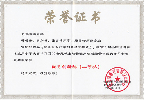 2014年6月至10月,第九届全国信息技术应用水平大赛“TiC100智慧城市与物联网创新经营模式大赛”专项竞赛在北京、上海、西安同时召开。公司3044AM永利研究生邵娇云、李加林和爱恩公司本科员工张容榕组队选送的项目《智能无人超市创新经营模式》经过层层选拔,最终在比赛中荣获全国二等奖,这是公司师生首次参与该比赛并获得奖项。