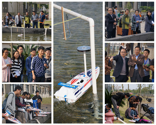 12:30,参赛队伍带着调试好程序的动力艇在三号教学楼旁的水池前准备,比赛拉开帷幕。当赛艇初次下水就失误,指导老师及时上前查看情况、给予建议,并随后安排第二轮试水;当优秀的作品