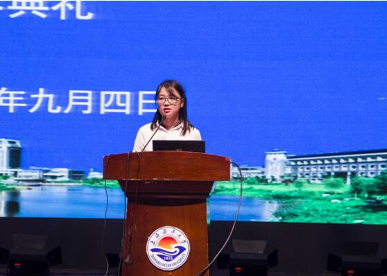 紧接着,2016级机制三班杨明月同学作为新生代表发言,她表示“大浪淘沙,经得过风浪考验的才是成功者;挥汗洒泪,抵得住烈日暴晒与意志考验的才是新时代的老员工”,并呼吁全体新生积极面对生活,坚决抵制诱惑,学习激励自我,全面锻炼自我。老生代表由原工程员工会主席、2013级电气二班的陶洁同学担任。她以自己优秀的大学经历为例,引出“这些都是别人的大学,那么你们呢”的话题,激励新生即便上了大学也不能放松,一样要拼搏努力,同时好好把握青春,不负光阴,乘风破浪!