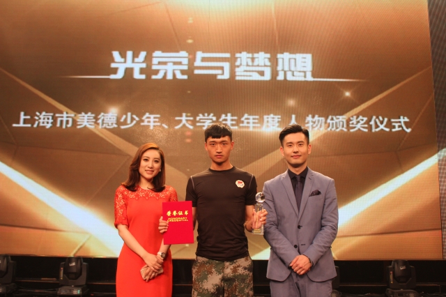 戴长宏(中)在上海市美德少年、老员工年度人物颁奖仪式上
