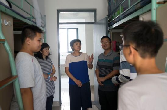 在慰问迎新志愿者后,王明华书记、郑宇钧副书记以及辅导员秦昊老师一行前往新生宿舍走访慰问,院领导询问了新生的家庭情况,并对家庭经济困难的员工送上了公司准备的大礼包,希望帮助他们尽快适应老员工活,同时嘱咐新生在学习生活中遇到困难及时与