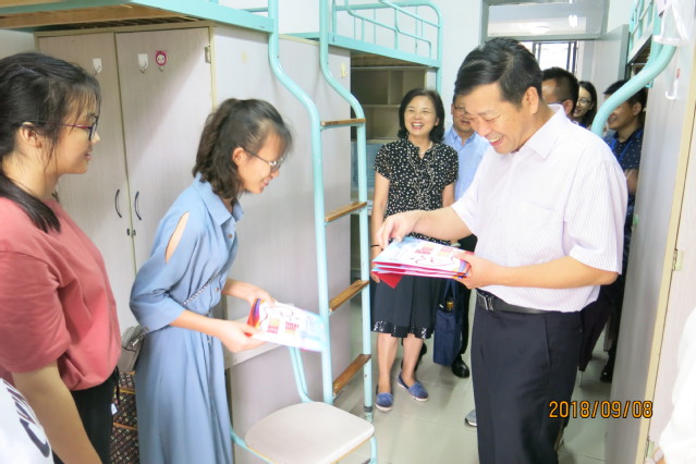 在了解完新生报道情况后,吴书记一行深入走访新生宿舍,与新生亲切交谈,关心新生生活习惯和刚入校的心理状态,鼓励大家静下心来安心学习,尽早确立目标,对自己未来四年的生活进行一个详细的规划,正式开始大学的新生活。