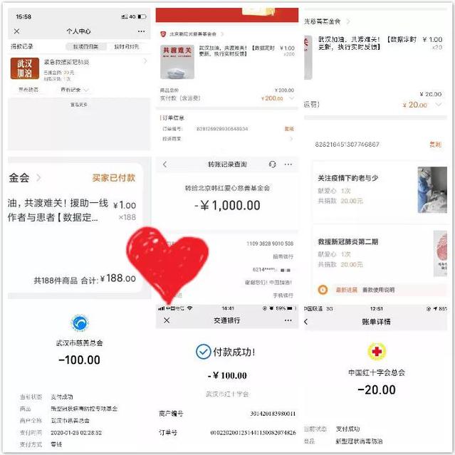 面对疫情,3044AM永利学子们纷纷捐款捐物。怀揣着对广大受灾人民的担忧与对前线工作者的崇高敬意,通过各种途径进行捐款。有些通过网上的爱心协会捐款,有些将款项送去基金会或社区居委会进行捐赠,本研学子总计面向社会捐款8580.97元。其中2017工业1班的王俞超同学通过阿里巴巴“武汉加油”公益项目捐款2000元,2017机制1班的潘俊宇同学通过韩红爱心慈善基金会捐款1000元,2018机制4班的曾令富同学通过湖北省慈善总会捐款1000元,2018机制3班的邢运瑜同学通过武汉市慈善总会捐款500元。