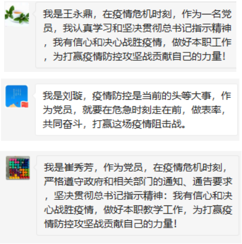 本次活动每位老师在群里发表对疫情的评论和祝福,讨论了“践行初心使命、打赢防控战役”的具体方法,网上讨论收到了良好的效果。