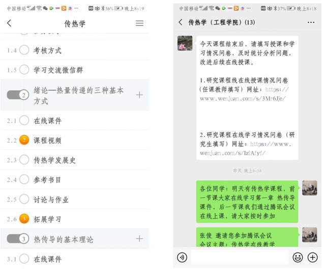 张俊老师是研究生《传热学》课程的授课老师,最近他总结了在线教学的经验,和老师们一起交流分享。为了上好每一堂课,他想了很多办法,在线教学授课中,综合利用了超星学习通、泛雅平台、腾讯会议、腾讯课堂、微信群等网络平台进行在线教学和课堂互动,逐步形成了一种“线上课件+录制视频学习+腾讯会议线上讲解+线下作业”的授课方式。考虑到员工隔离在家,教材和相关学习资料不足,通过各种途径为员工准备电子教材、参考书、学习视频等大量学习资料。上课前,通过在微信布置课件和录制视频的学习内容、腾讯会议线上讲解的时间、会议ID号等!前一节课让员工在泛雅平台学习课件和录制视频,后一节课通过腾讯会议进行讲授重点、现场答疑、讨论等方式授课。