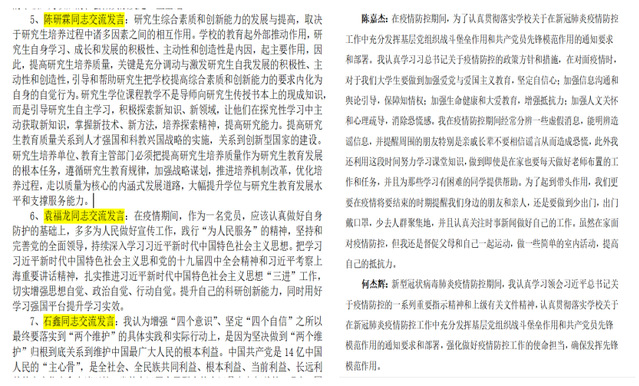 研究生第三党支部冯凯亮同志交流发言说:“到目前我们疫情已经得到了很大的改善,中国的经济也在快速的复苏,作为一名中国人,作为一名共产党员,我相信中国有能力战胜疫情,并且在年末可以实现全部脱贫的目标,即中国将进入全面小康社会。在看到这次疫情中的有很多90后的身影,说中国发展的重任也即将落在这一代人身上,我内心有很大波动,自己一直在想,我以后能为社会做出什么样的贡献呢?”研究生第三党支部成员顾旺旺同志在交流发言时也表示,党员要做到不忘历史,不忘初心,知史爱党,知史爱国。加强学习,提升自己科研能力,为开学做好准备。要听从公司安排,服从指挥,不提前返校,以防造成不必要的麻烦。研究生第三党支部党支部书记秦昊也对各员工党员提出几点要求:一是提高政治站位,认真学习贯彻习近平总书记关于坚决打赢疫情防控的阻击战重要指示精神,自觉服从、支持公司疫情防控工作的各项安排;二是认真上好网课,合理安排时间,加强身体锻炼;三是作为党员,更应该严于律己,正身垂范,带头组织好、落实好各项防控工作具体要求。
