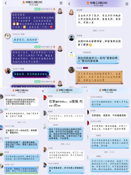 战疫路上,我们携手共克时坚,团结一致共同抗疫。在这个特殊的假期,我们“宅”在家里学习防疫知识的同时,更要阅读文学、哲学经典陶冶情操,认真学习专业知识,通过居家锻炼来强身健体,陪伴长辈、传承中华民族传统美德。各团支部都响应号召,通过学习打卡群、单词软件打卡等方式自主学习,更通过家庭劳动、keep打卡强健体魄。