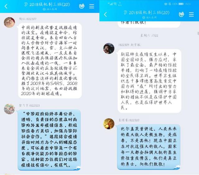 各团支部结合自身实际,并善于利用网络平台,在易班、QQ群等平台上进行了防疫知识的专项学习和讨论活动,团员青年们踊跃发言,认真学习健康防病知识、提高自我防护能力,并积极学习习近平总书记关于新冠肺炎疫情防控的重要讲话精神。
