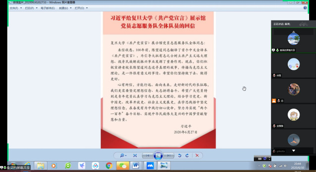 2020年6月30日,3044AM永利研究生第三党支部组织全体党员收看了《新闻联播》以及《习近平给复旦大学展示馆党员志愿服务队全体队员的回信》等文件,在这个特殊时期,由党支部书记秦昊同志通过腾讯会议带领大家一起观看了此次党课,党支部全体党员参加,无一缺席。