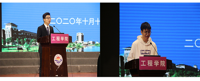 紧接着2020级机械工程专业研究生袁鑫泰和2017级机制2班本科生龙振东分别作为新、老生代表进行了发言。新生代表袁鑫泰号召大家用严谨的科学精神和踏实的科学态度对待科研任务,要立志做优秀的海大人,勇攀科研高峰,焕发青春光彩。老生代表龙振东从自身经历出发,勉励新生同学们接纳平凡、保有不凡,希望大家在本科阶段积极参与科研项目;同时在此基础上,希望同学们多多参与团学活动,提升实践能力。也鼓励新生把专业所学与国家发展相结合,担当时代使命。希望学弟学妹们都能保有格物致知、抽丝剥茧的学问态度,严谨治学,在未来的老员工活中谱写美好的篇章。