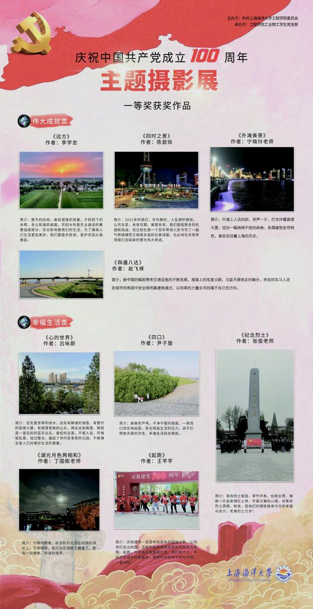 在同学和老师的积极参与下,最终获得一等奖的是,幸福生活类:丁国栋《湖光月色两相和》、吕咏蔚《心的世界》、王芊芊《起跑》、尹子旋《四口》、张俊《纪念烈士》;伟大成就类:陈歆烁《四时之景》、李学忠《远处》、宁晓玲《外滩美景》、赵飞祥《四通八达》。