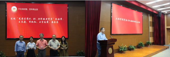 大会第三篇章是“不忘来时路,百年再出发”。首先,张雅林书记为王永鼎、宋秋红、上官春霞和潘喜喜4名党员同志颁发“光荣在党10、20、30年老党员”纪念章,感谢他们为公司做出的贡献;随后,全体师生党员在王永鼎同志带领下,重温入党誓词。