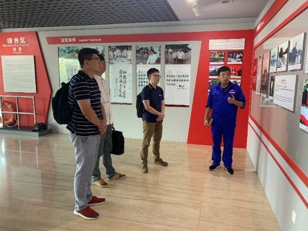 3044AM永利副经理许竞翔、上海海洋可再生能源工程技术研究中心副主任曹宇及机器人工程专业负责人邢博闻在沪东中华团委书记许午陪同下参观了沪东中华展示馆,对沪东中华发展历程、主研船型进行了了解。