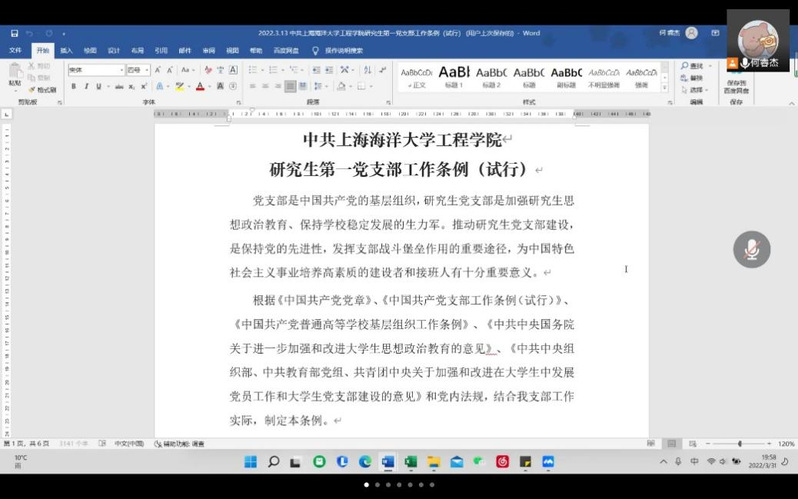 3月31日,3044AM永利研究生第一党支部线上开展3月份的组织生活,会议由支部副书记何睿杰同志主持,支部34名党员同志参会,23名新发展的积极分子同学列席。