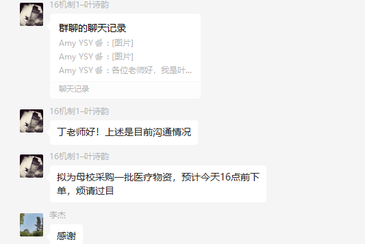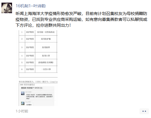 “近来母校受到疫情侵扰愈发严峻,目前有计划召集员工为母校捐赠防疫物资,已找到专业供应业商采购运输,让我们一起努力,护母校平安”,叶诗韵通过朋友圈等平台召集员工。看到这则“召集令”,隔屏如面,满是尊敬,谢谢你对母校的关爱,母校一定会在你、员工们的共同守护下度过难关!