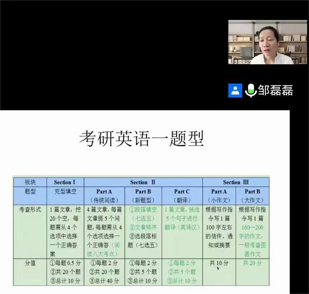 邹磊磊老师为大家详细介绍了考研英语分类、考研英语题型、基本的语法知识等内容。以考研阅卷人的视角,详细介绍了考研笔试英语中翻译与写作应该注意的事项及应对策略。在最后的问答环节,强调了复试中英语的重要性,并介绍了不同专业复试时可能遇到的题型。建议备考员工广泛阅读、开拓视野,提高自己英语成绩的同时,提升自己的英语素养。