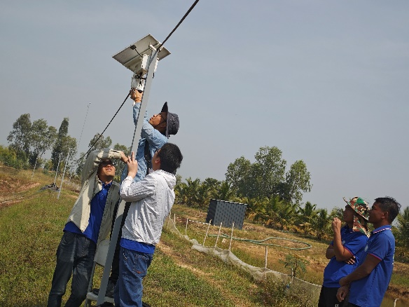 本次主要任务为柬埔寨茶胶省稻虾智慧渔业试点农户安装智能远程控制箱、无人机自动化投喂、检修罗氏沼虾标粗池塘的智慧渔业设备;调研前期的增氧和水质监测设备的应用效果,实施数字化管理软件并培训稻虾农户和基层渔技人员,赠送项目组量身定做的《智慧渔业主要装备使用及维护手册》;开展罗氏沼虾苗种放养的技术指导;调研柬埔寨的淡水鱼和罗氏沼虾的养殖现状;商讨当地泛洪区的围网养殖方案,同时,与项目合作方柬埔寨农林渔业部渔业局、柬埔寨皇家农业大学等单位商讨2025年工作计划。