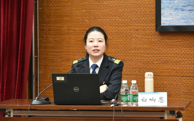 白响恩船长以“好奇心、恒心、爱心”为主线展开授课。她以自身经历为切入点,回顾一路追逐航海梦想的经历,交流分享极地科考时北冰洋冰区被困、挑战直升机探冰首飞等惊险历程。她讲到,航海人的初心不仅是探索未知的勇气,更是将“小我”融入“大我”的责任担当。在长期海洋航程和探索中,支撑大家的就是党性觉悟、科学精神与团队协作,战胜困难的唯一路径就是相信自己、勇往直前。