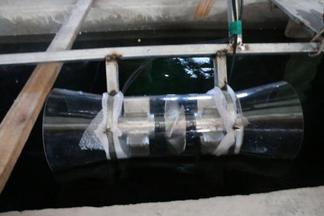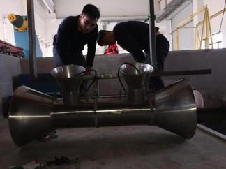 结合理论分析及三维模拟仿真分析,将从导流罩、叶轮、整体装置方面进行实验研究,采集相关参数数据,验证海洋发电装置的合理性和稳定性。水槽测试是在动水槽中进行,模拟不同海浪状态下,测试装置的原理及其结构设计的合理性、流体动力性、能量转换率、电能传输性等技术性能;在水槽试验的基础上对上述指标进行修正和优化。